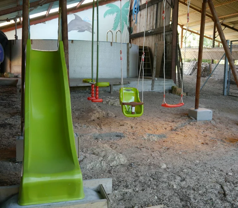Für die Größeren und Großen gibt es auf über 2500 qm ummauertem und umzäuntem Gelände dann noch mehr Raum zum Spielen und Toben: Man kann sich verstecken, wettlaufen, schaukeln, am Kletterseil klettern, die Rutsche hinunterrutschen, Tischtennis spielen oder den Ball in den Korb werfen.