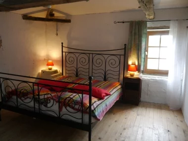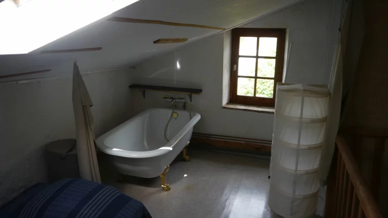 Im Jahr 2024 entschieden wir, doch den Bodenraum über der Wohnung Suzanne (die eine Schall- und Wärmeisolierung bekommen hatte) im Dach auch isolieren zu lassen. Diesmal komplett bis unters Dach, mit teils 3,5 m Höhe. Dies Zimmer ist momentan noch im ungestrichen-schönen Zustand, hat Raum und ist ausgestattet mit 2 Betten je 90 x 190 und einem 160er Doppelbett in Metallgestell, sowie 1 großen Kleiderschrank, 2 kleinere Schränkchen und einen Tisch mit Stühlen. Das Zimmer kann 4 Gäste aufnehmen und Spielzimmer sein, auch relaxtes „Balken beobachten“ erlauben. Nora ist eine Wohnung für Menschen, die auch „Altes“ mögen und Sinn für Kompromisse haben. Belohnung: Platz ist gut vorhanden!