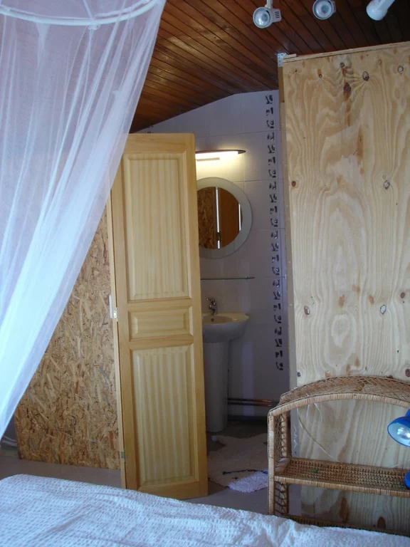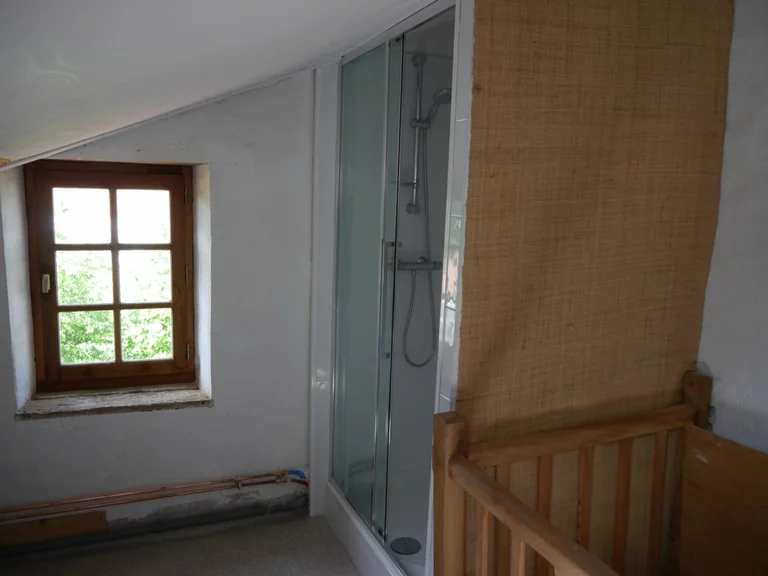 Im Küchen-Esszimmer gibt es Abstellraum unter einer kleinen Treppe, die hinauf ins Schlafzimmer mit Fenster nach Westen, ebenfalls mit Außenladen, führt. Im Zimmer gibt es 2 Betten, je 80 x 190, und einen eingebauten Kleider- und Wäscheschrank, eine kleine Kommode und einen Schreibplatz mit Sessel. Durch das Schlafzimmer kommt man in das Duschbad mit Waschbecken, Dusche und WC, mit Ventilatorbelüftung nach draußen. Darüber hinaus steht den Bewohnern von Suzanne ein zweites WC mit Waschbecken, sowie eine Waschmaschine im direkt vom Garten aus zugänglichen Technikraum des Hauses (Brunnenzisterne, Stromzähler/Sicherungen) zur Verfügung.